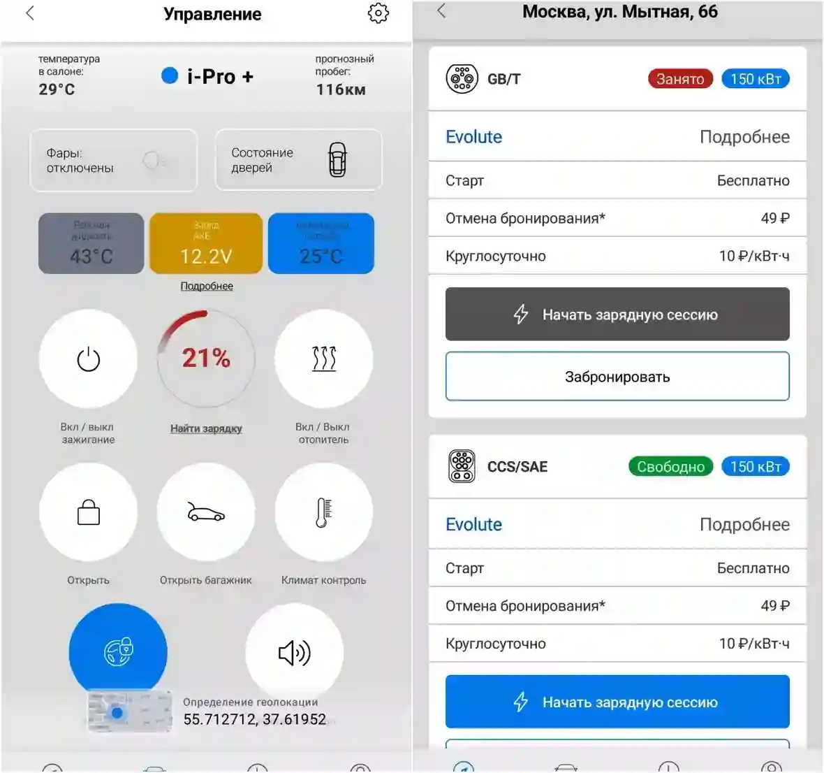 Мобильные приложения для удаленного контроля стали популярными. Для электромобилей их ценность выше: можно управлять процессом зарядки и микроклиматом в салоне. В фирменной сети зарядок EVOLUTE есть редкие пока для России особенности – мощность до 150 кВт и быстрая зарядка для китайского разъема GB/T.