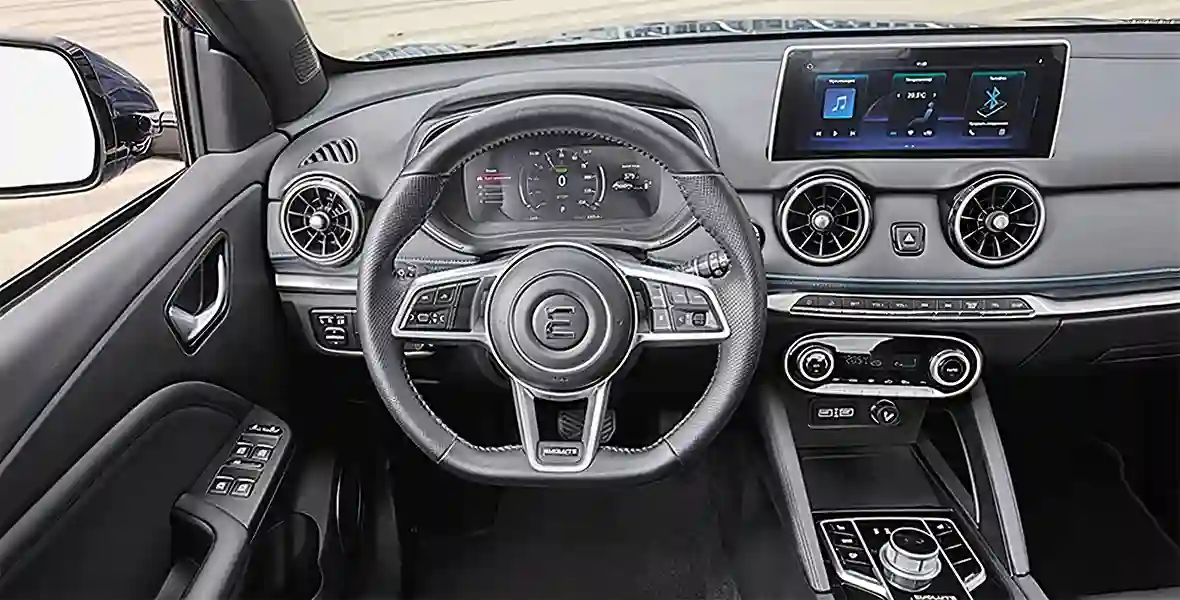 Интерьер, на наш взгляд, получился симпатичнее экстерьера, возможно, потому, что некоторые элементы стилисты подсмотрели у автомобилей Audi. Впрочем, хватает и оригинальных черт: к материалам отделки не придраться, а цифровое и аналоговое в компоновке сбалансированы. К примеру, виртуальный щиток приборов рисует крупные, хорошо читаемые цифры скоростного режима, а вместо тахометра на экран выведены шкалы расхода и заряда батареи.