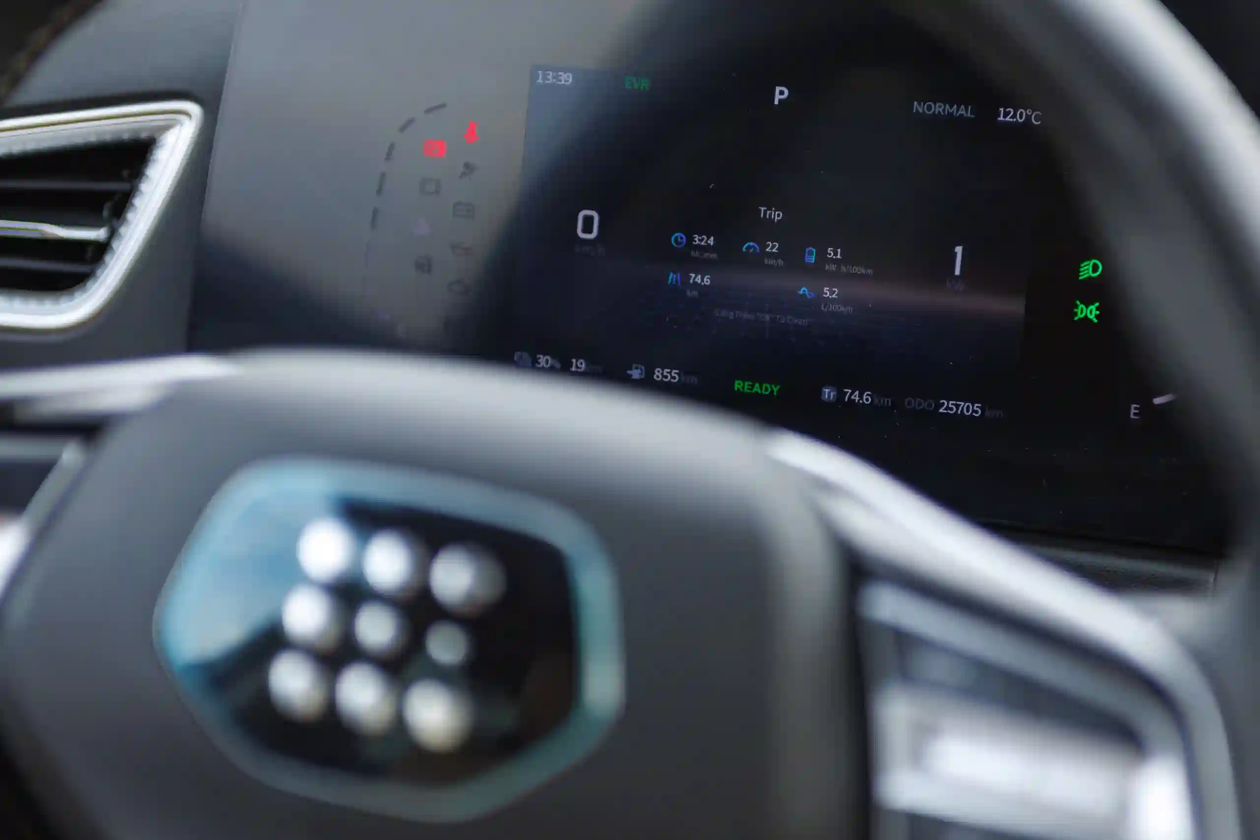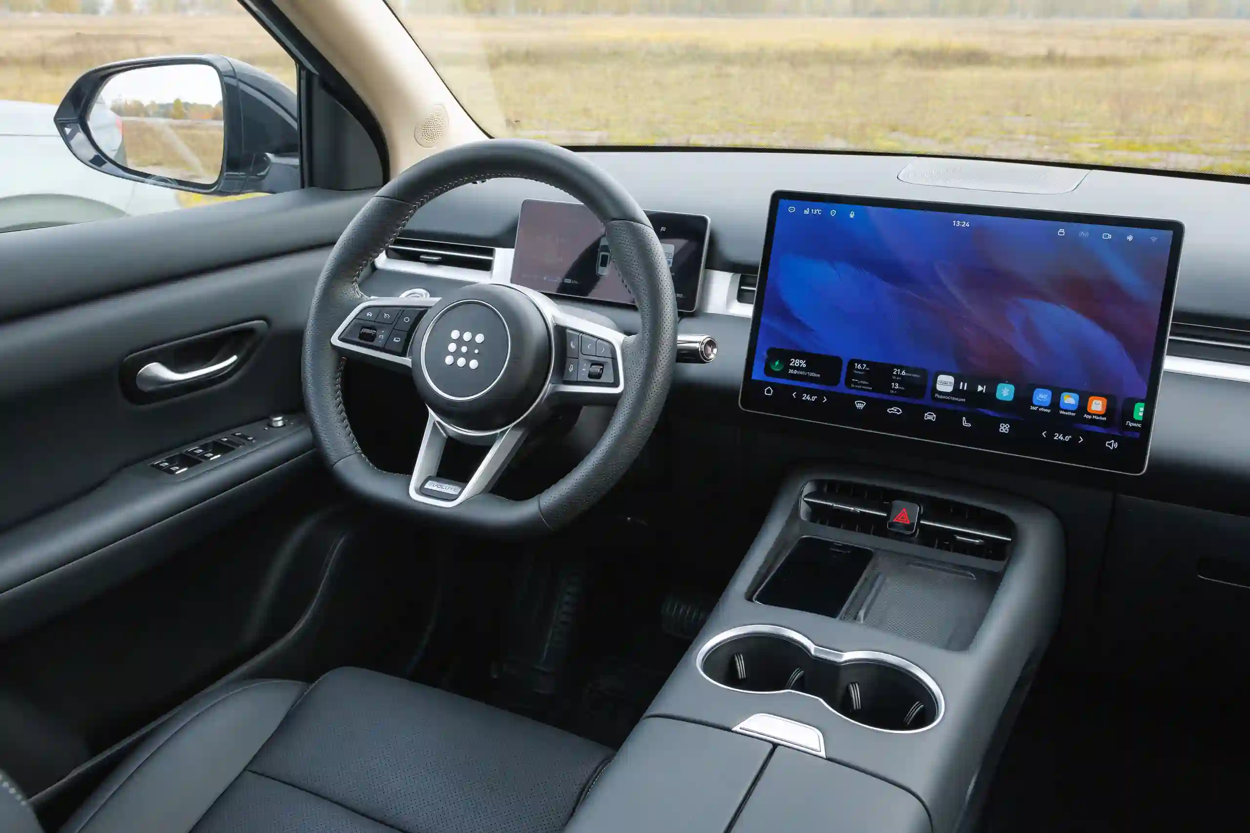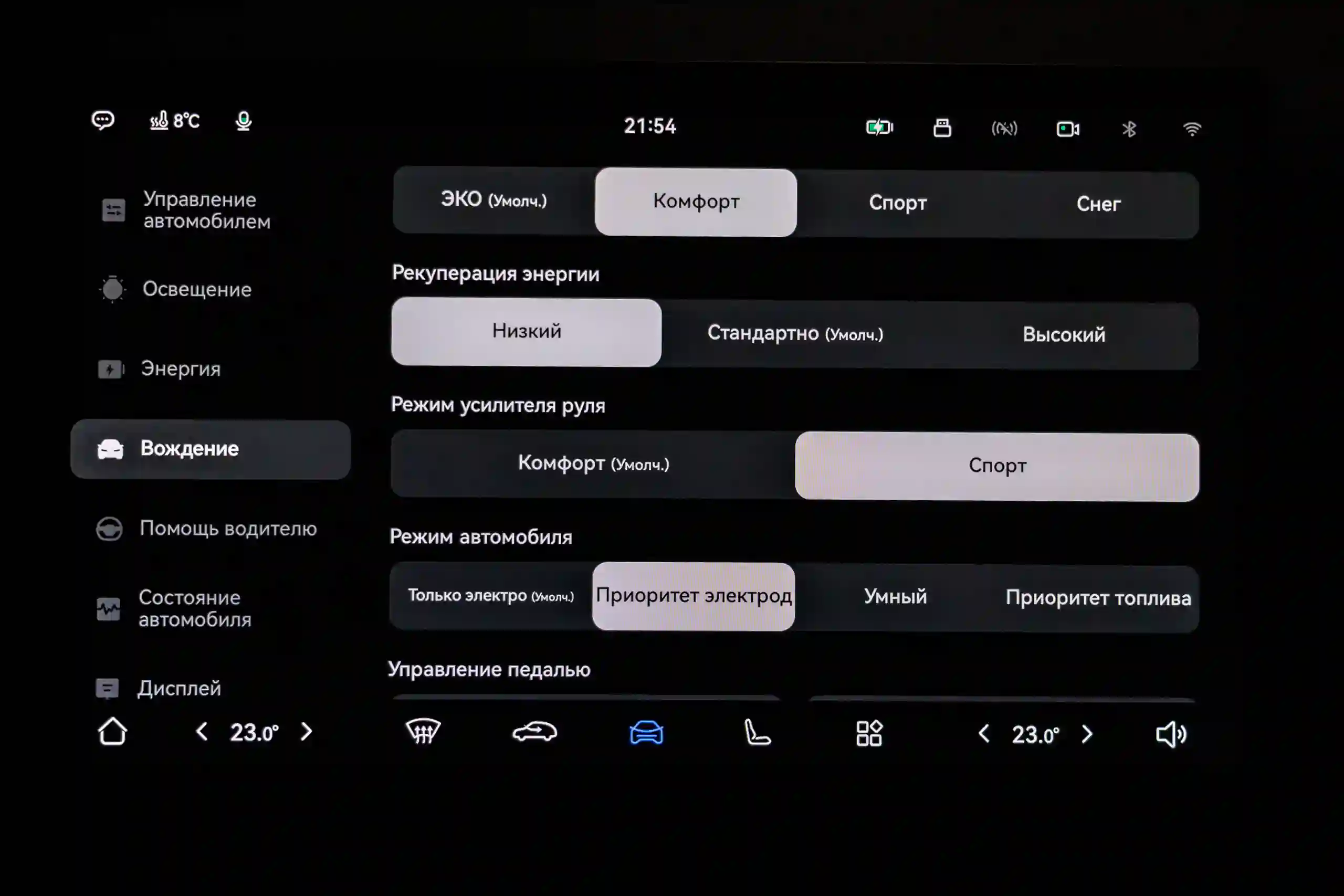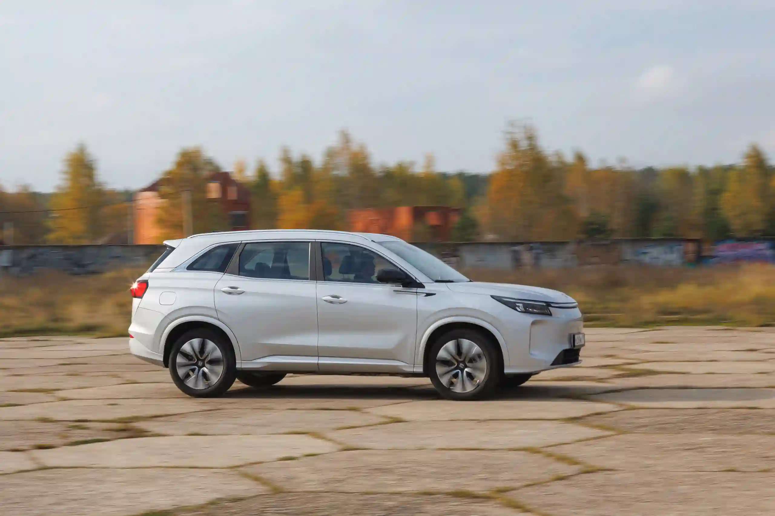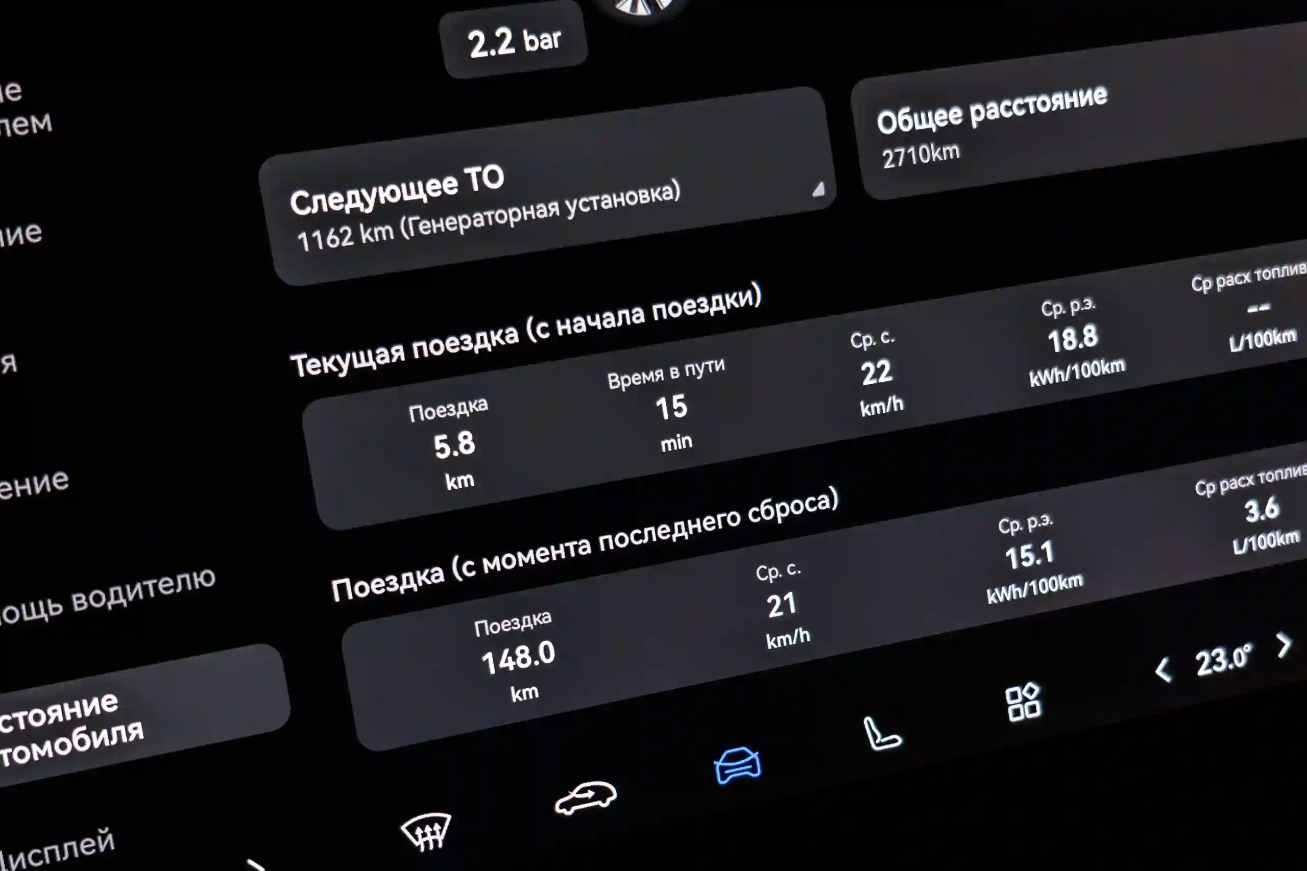 Длина окружности МКАДа — 109 км. Такой же запас хода на электротяге после полной зарядки батареи отображал и EVOLUTE i‑SPACE прошлого модельного года, хотя его практический максимум был 75-80 км. Чтобы проехать столько в чистом режиме, требовалось вести машину очень плавно и бережно. Но при снижении уровня заряда до 25% автомобиль всё равно сам выходил из режима EV и подключал генерацию.