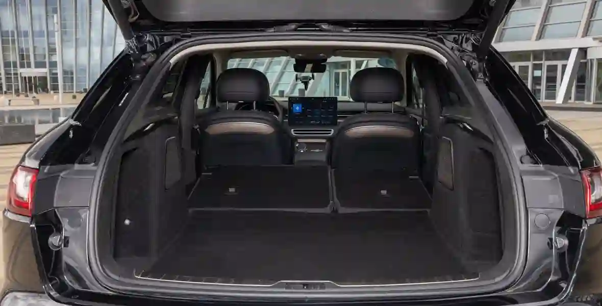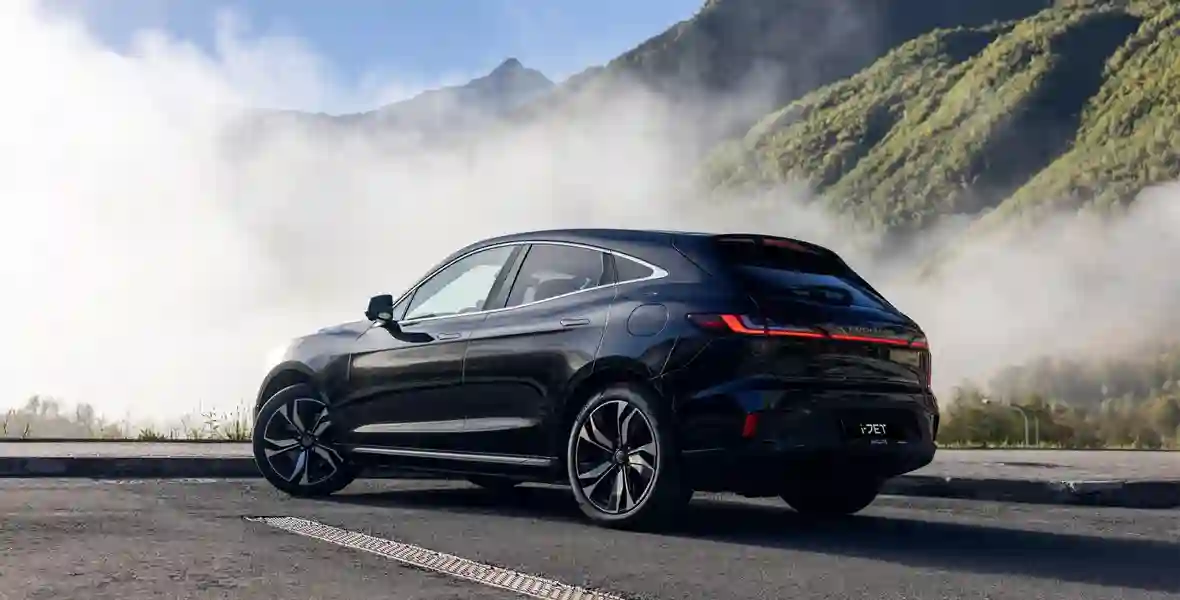 Формой кузова EVOLUTE i‑JET напоминает о Porsche Macan — особенно похожа задняя часть, где с немецким спортивным кроссовером его роднят не только светодиодные фонари во всю ширину, но и расположенная на креплении стеклоочистителя кнопка открывания двери багажника.